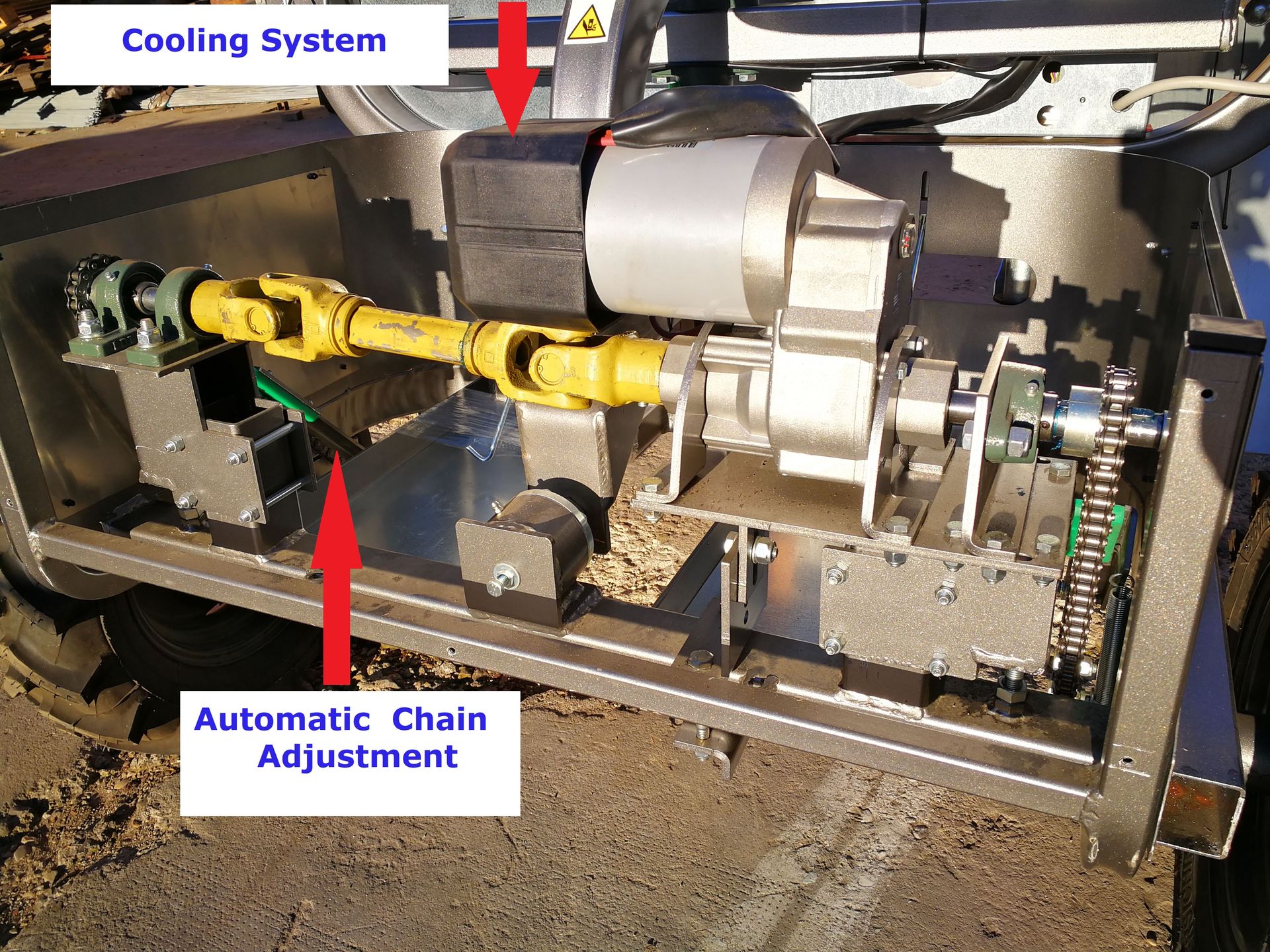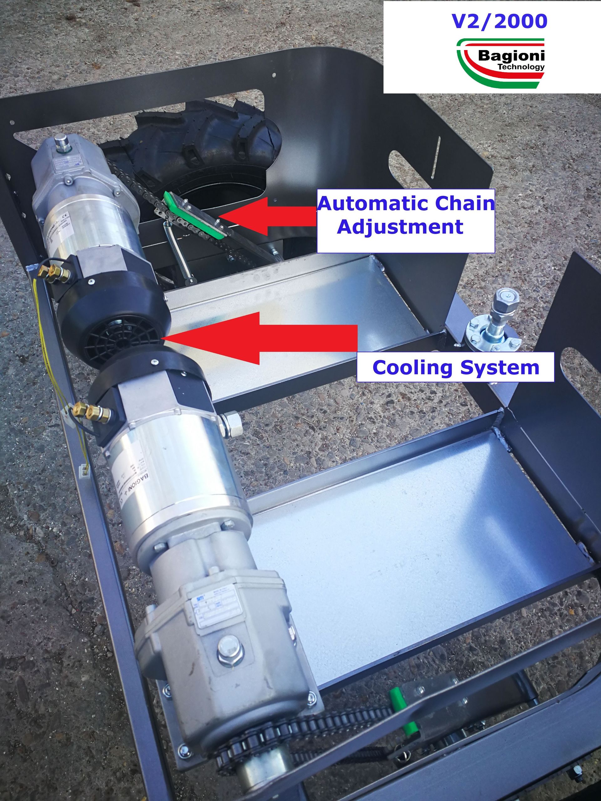 La macchina è dotata di due motori da 800 watt continuativi, con cassa sigillata IP55 e sistema di raffreddamento convettivo. I materiali utilizzati sono progettati per resistere a temperature fino a 80°C, assicurando affidabilità anche durante le giornate di lavoro più impegnative.