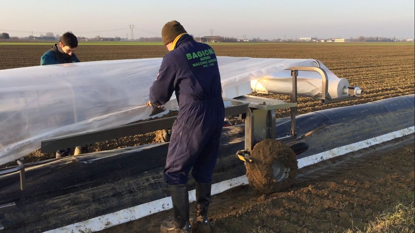 Questo meccanismo crea un’apertura che permette agli operatori di raccogliere l’asparago in modo rapido. Dopo il passaggio della macchina, il film viene riposizionato automaticamente, mantenendo la corretta copertura della coltura.